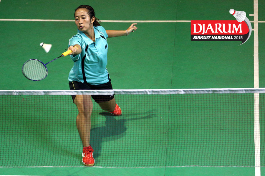 Febby Angguni (Tjakrindo Masters) mengembalikan shuttlecock ke arah Rafika Mutiara (Candra Wijaya).