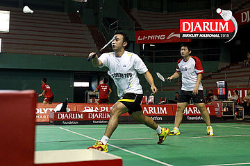 Rifan Fauzin (Pelita Bakrie) mengembalikan shuttlecock ke arah Alvindo Saputra (Tangkas).