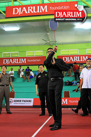 Gubernur Sumatera Barat, Irwan Prayitno melakukan pukulan pertama sebagai simbolis dibukanya Djarum Sirkuit Nasional Li-Ning Sumatera Barat Open 2014
