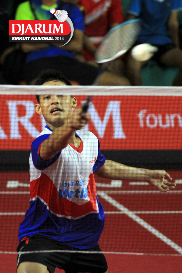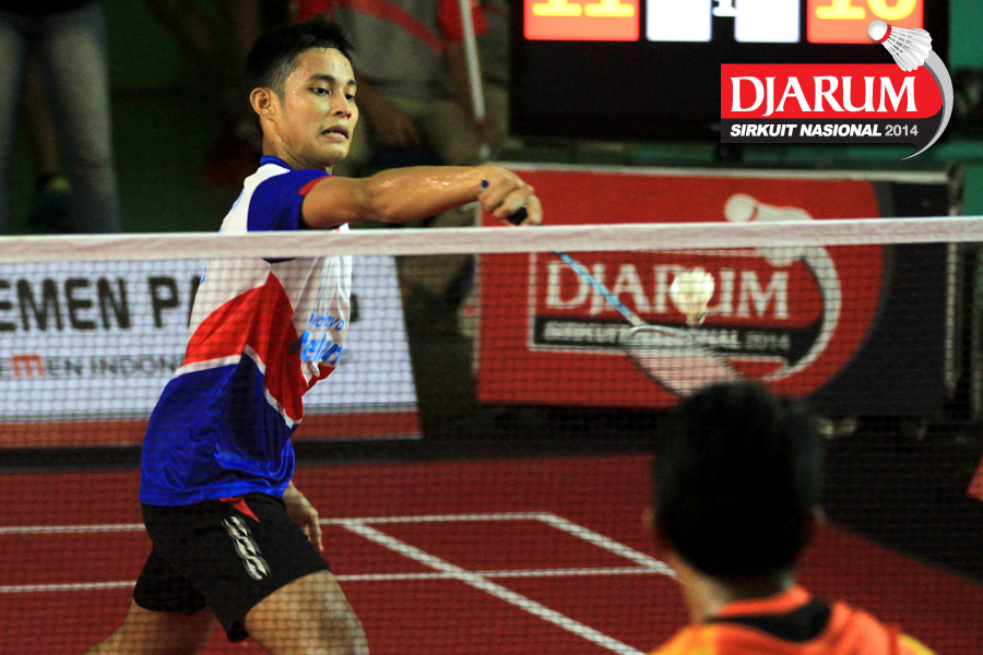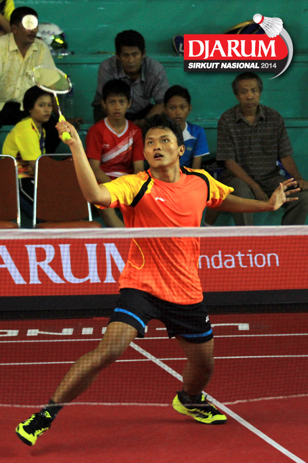 Imam Adi Kusuma (Jaya Raya) mengembalikan shuttlecock ke arah Hengki Pribadi (PBSI Padang Pariaman)