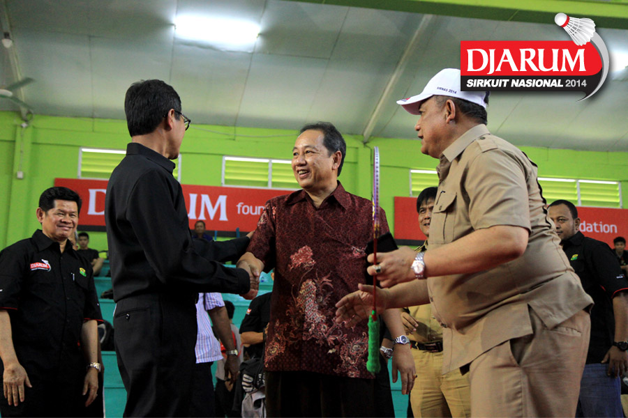 Gubernur Sumatera Barat, Irwan Prayitno bersalaman usai melakukan pukulan pertama sebagai simbolis dibukanya Djarum Sirkuit Nasional Li-Ning Sumatera Barat Open 2014