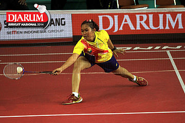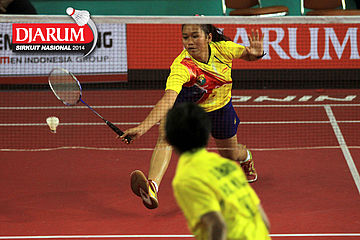 Mega Ciputra (Djarum Kudus) mengembalikan shuttlecock ke arah Wiranto (Sarwendah)
