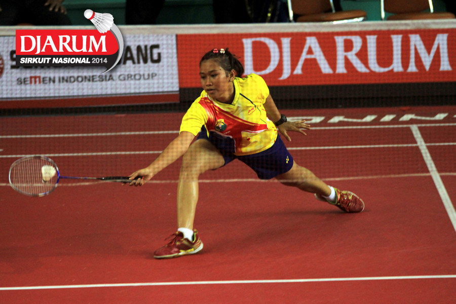 Wiranto (Sarwendah) berhasil menghadang serangan yang dilepaskan Mega Ciputra (Djarum Kudus)