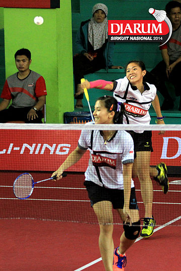 Jessica Muljati/Yulia Yosephine (Shamrock Medan) menyambar pengembalian dari Deariska Putri/Sri Wulan (Djarum Kudus/Jaya Raya)