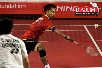 Alamsyah Yunus (JR Enkei) mengembalikan shuttlecock ke arah Christofle Brians (Pelatprov DKI Jakarta)