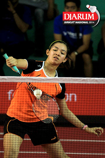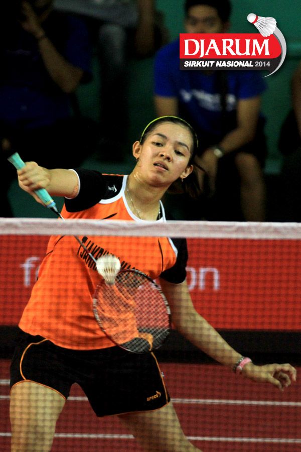 Febby Angguni (Tjakrindo Masters) mengembalikan shuttlecock ke arah Mega Cahya (Jaya Raya)