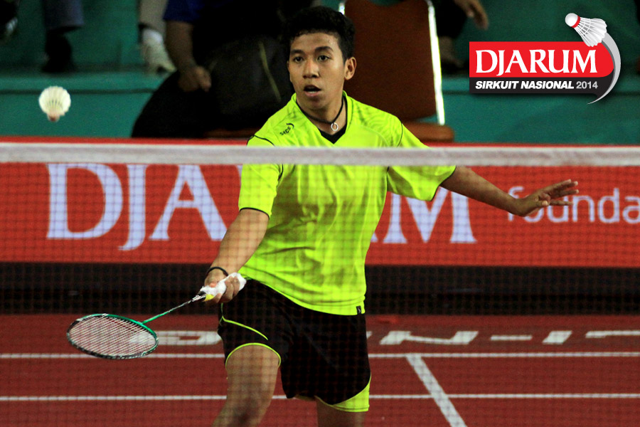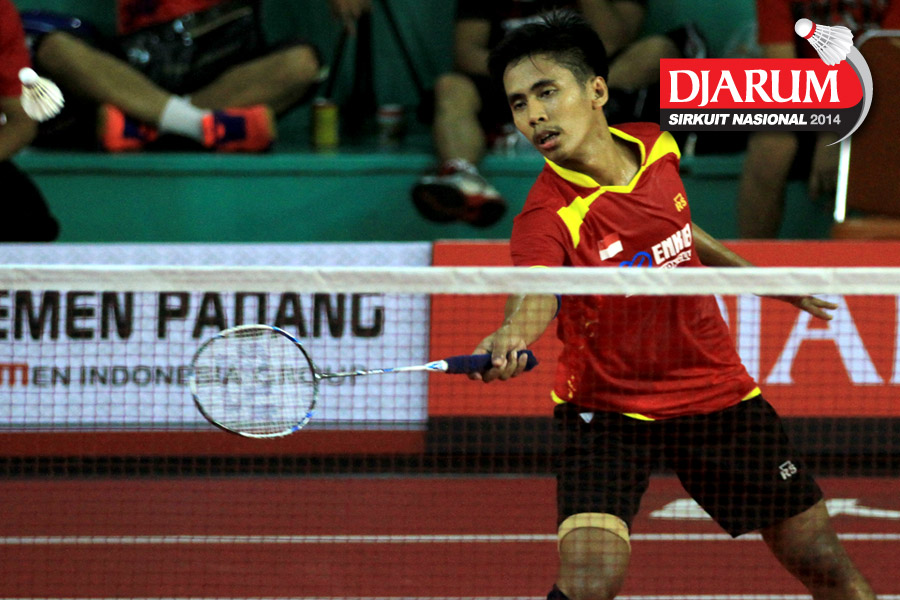 Nugroho Andi (JR Enkei) mengembalikan shuttlecock ke arah M. Nizar (Pelatprov DKI Jakarta)