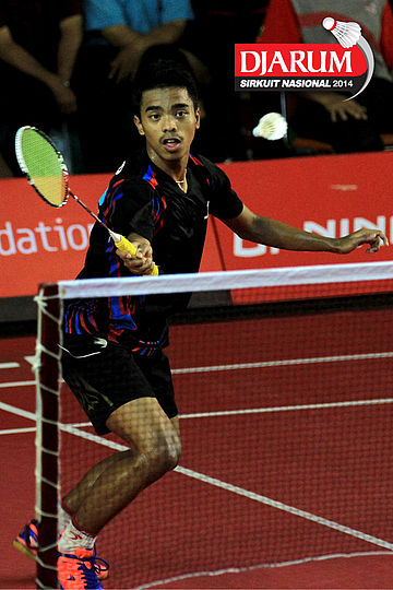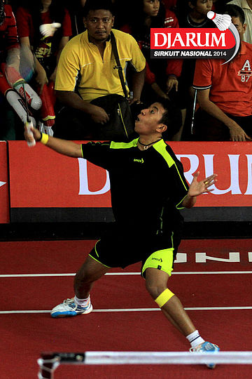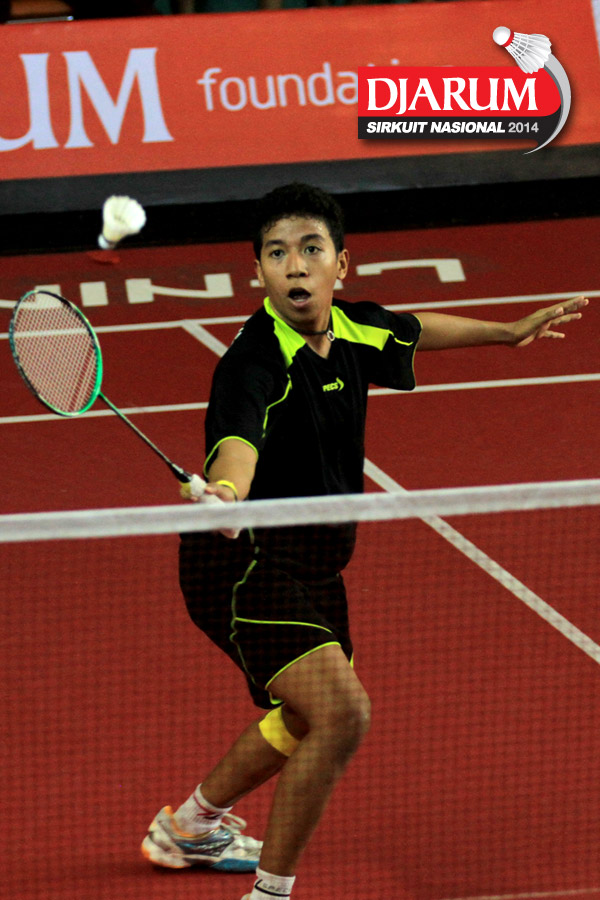M. Lutfi Erlangga (Mutiara Cardinal) mengembalikan shuttlecock ke arah Redy Perdana (Pusdiklat Telkom)