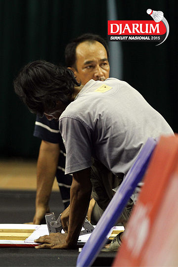 Dua pekerja saat menyelesaikan dekorasi Djarum Sirkuit Nasional Li-Ning Sumatera Selatan Open 2015