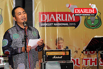Asisten III Pemerintah Provinsi Sumatera Selatan, Ahmad Najib saat mewakili Gubernur dalam memberikan sambutan sekaligus membuka gelaran Djarum Sirkuit Nasional Li-Ning Sumatera Selatan Open 2015
