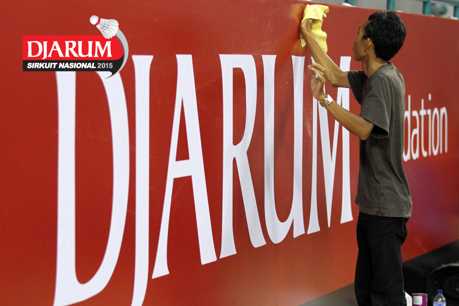 Seorang pekerja saat menyelesaikan dekorasi Djarum Sirkuit Nasional Li-Ning Sumatera Selatan Open 2015