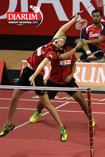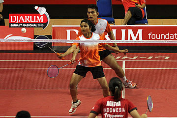Harum Dinar/Tania Oktaviani (Djarum Kudus) mengembalikan shuttlecock ke arah M. Agung Gumilar/Aghisna (Hi Qua Wima/Semen Gresik)