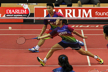 M. Taufiqul/Munada Choirunnisa (Djarum Kudus) menyambut pengembalian dari Emanuel Randy/Nur Aisyah (Pelatprov PBSI DKI Jakarta)