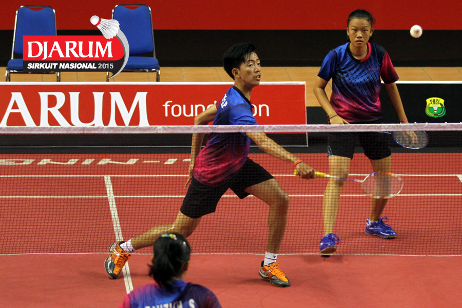 Riezky Admajayandi/Nurul Fothanah (Pusdiklat SMA Olahraga Riau) mengembalikan shuttlecock ke arah Feisal Wiranto/Agatha Imanuela (Djarum Kudus)