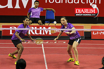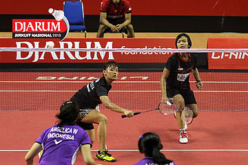 Aisyah Nuraini/Angelica Wiratama (Exist) bersiap menghadang serangan yang dilepaskan Agatha Imanuela/Siti Fadia (Djarum Kudus)