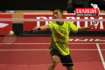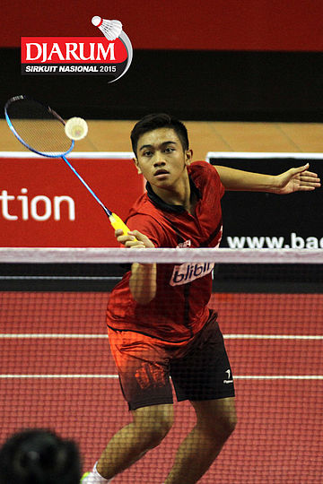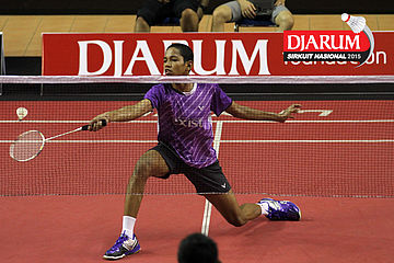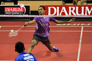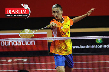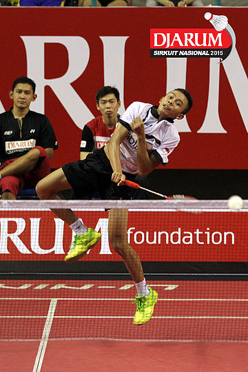 Ramadhani M. Zulkifli (Djarum Kudus) melepaskan smash ke arah M. Ahdial Okta (Pelatprov PBSI DKI Jakarta)