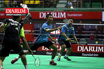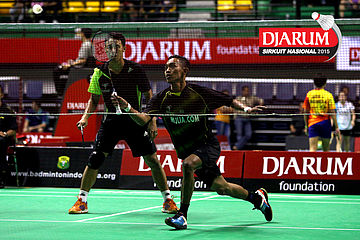 Chrisna Adi/Ridho Akbar (Halim) mengembalikan shuttlecock.