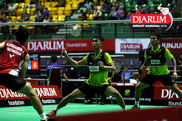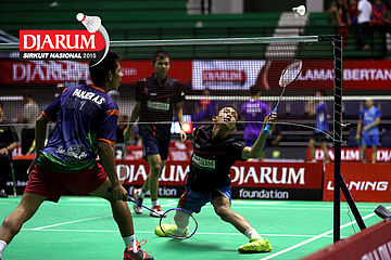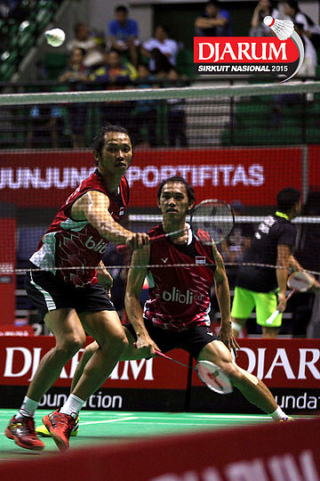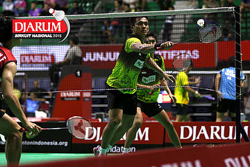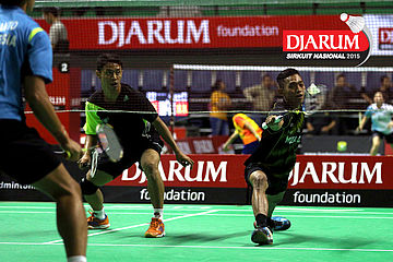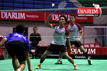 Andrei Adistia/Hendra Aprida Gunawan (Djarum Kudus) bersiap menyambar pengembalian tanggung.