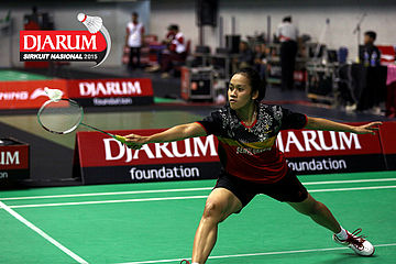 Aprillia Yuswandari (Semen Gresik) mengembalikan shuttlecock.
