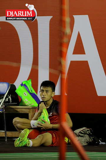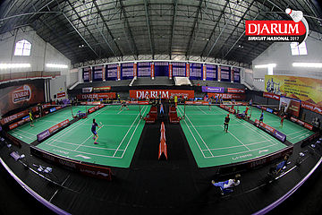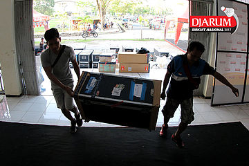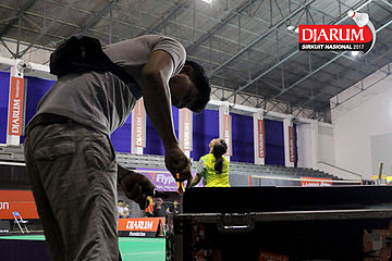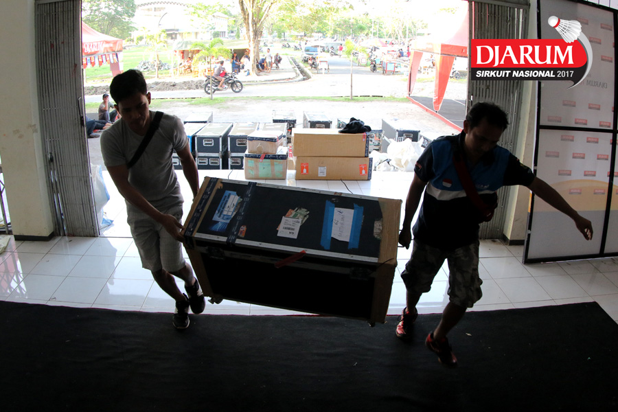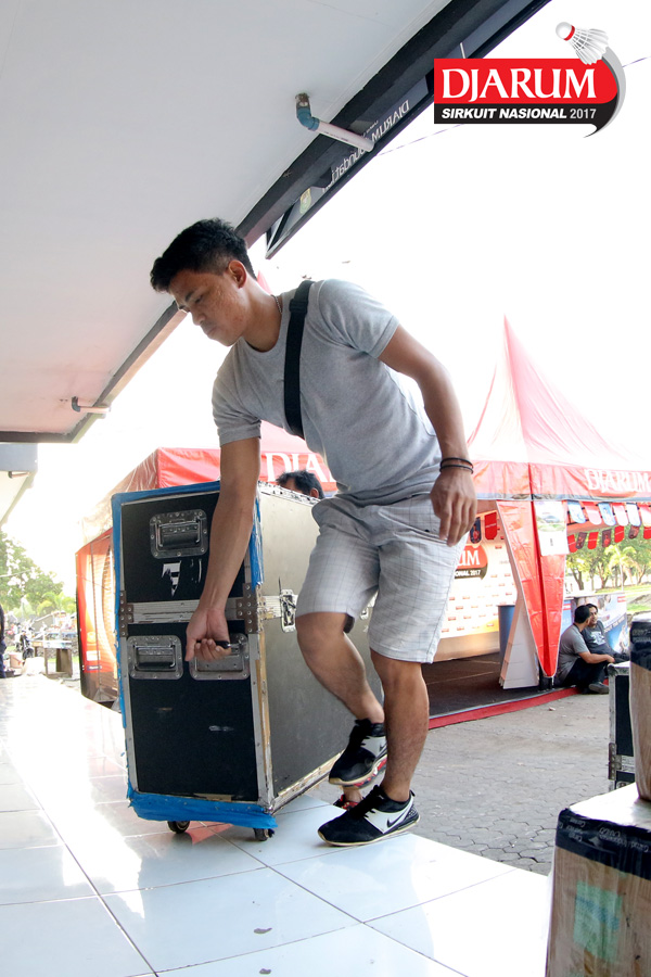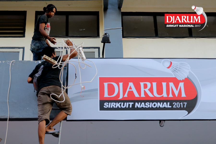 Dua Pekerja Saat Memasang Instalasi Logistik Djarum Sirkuit Nasional Li-Ning NTB Open 2017
