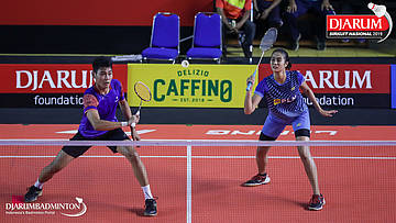 Joshua David Wardana+Dinda Haura Salsabila Suhana (Tangkas , Jaksel+Sangkuriang Graha Sarana PLN Bandung) bersiap menyambut shuttlecock