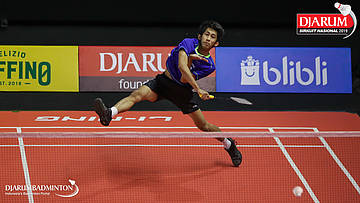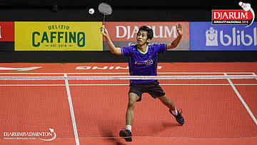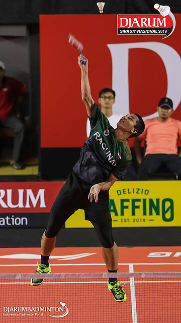 Wisnu Yuli Prasetyo (Pertamina Fastron, Jakut) bersiap menyambut shuttlecock