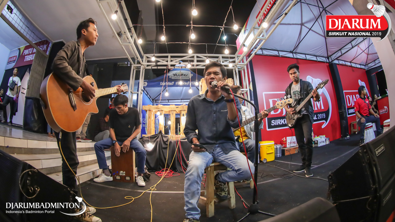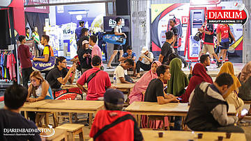Dua orang pengunjung saat memilih merchandise di booth djarum