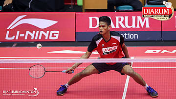 Muh. Asqar Harianto (PB Djarum, Kudus) bersiap menyambut shuttlecock