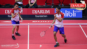 Asghar Herfanda+Rian Canna Varo (PB Djarum, Kudus) menyambar pengembalian
