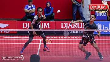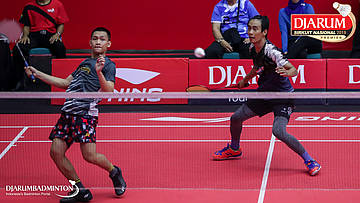 Ivan Adi Cahyono+Vincentius Suwarland (PB Djarum, Kudus) menyambar pengembalian