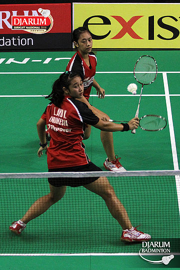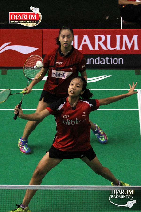 Febriana Dwi/Ribka Sugiarto (Djarum Kudus) mengembalikan shuttlecock
