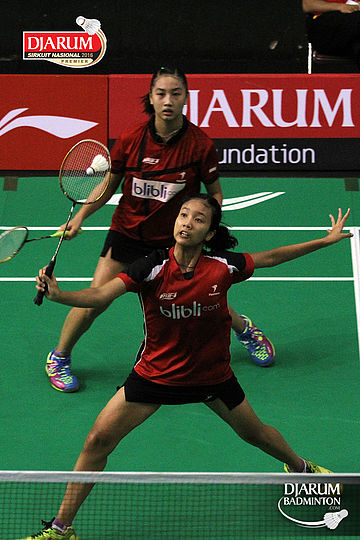 Febriana Dwi/Ribka Sugiarto (Djarum Kudus) bersiap menyambar pengembalian tanggung