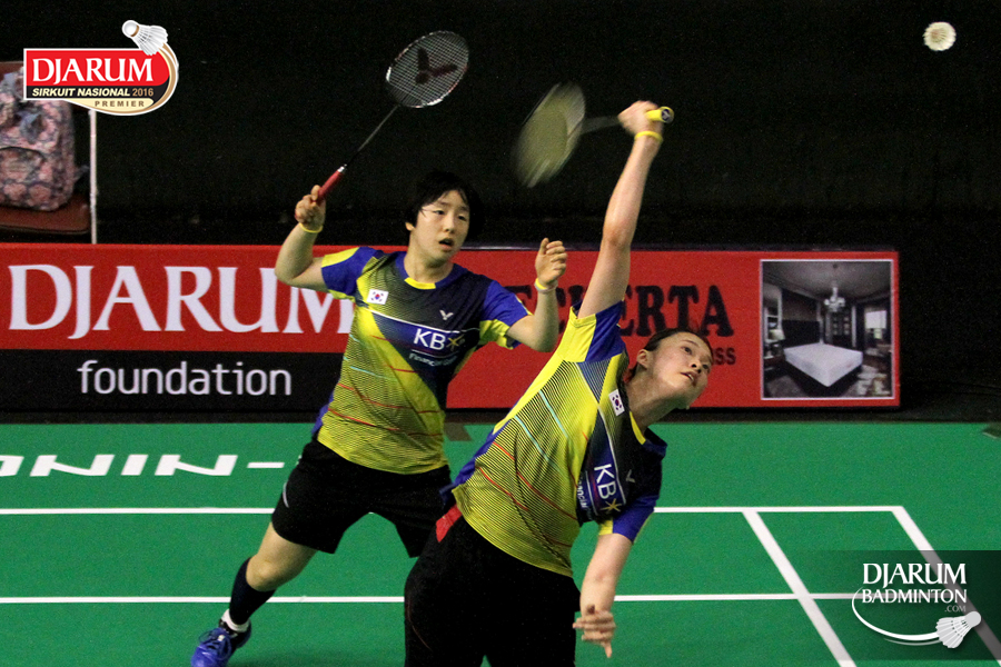 Ga Eun Kim/Hyang Im Kim (Korea) bersiap menyambar pengembalian