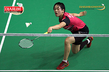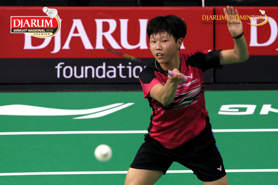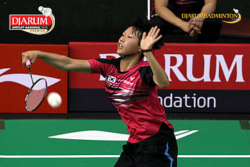 Ha Na Baek (Korea) mengembalikan shuttlecock