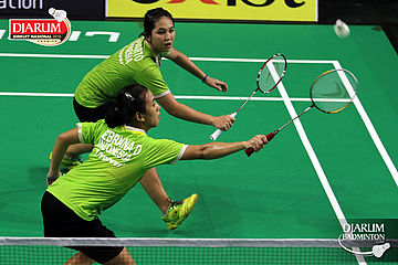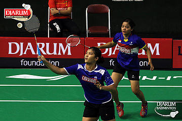 Febriana Dwipuji/Ribka Sugiarto (Djarum Kudus) menghadang serangan