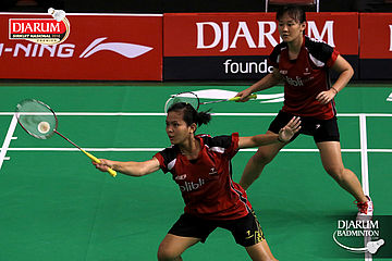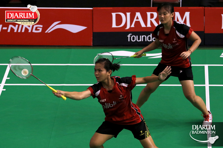 Gebby Ristiyani/Weni Anggraeni (Mutiara Cardinal/Jaya Raya) bersiap menyambut pengembalian