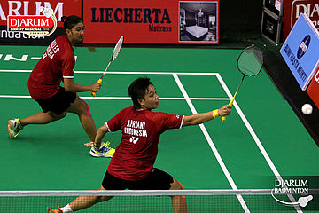 Helmi Abbu/Rehan Naufal (Djarum Kudus) menghadang serangan