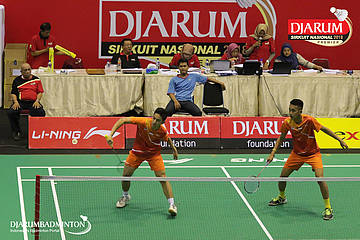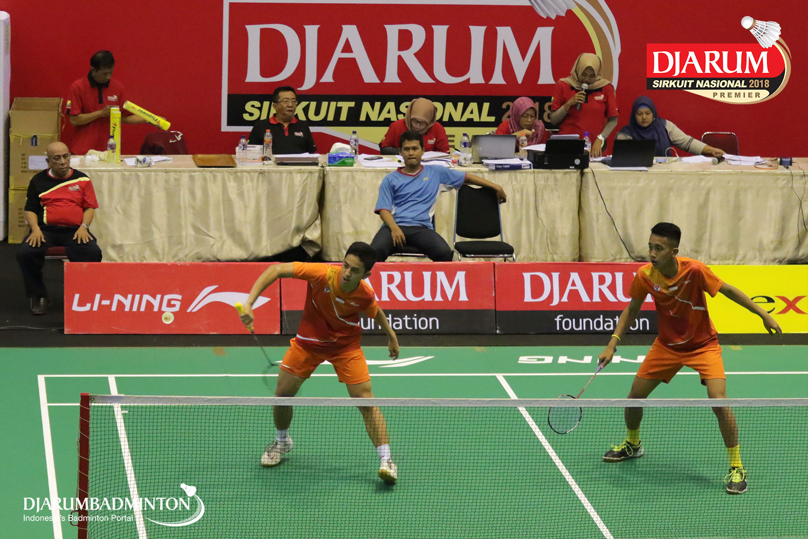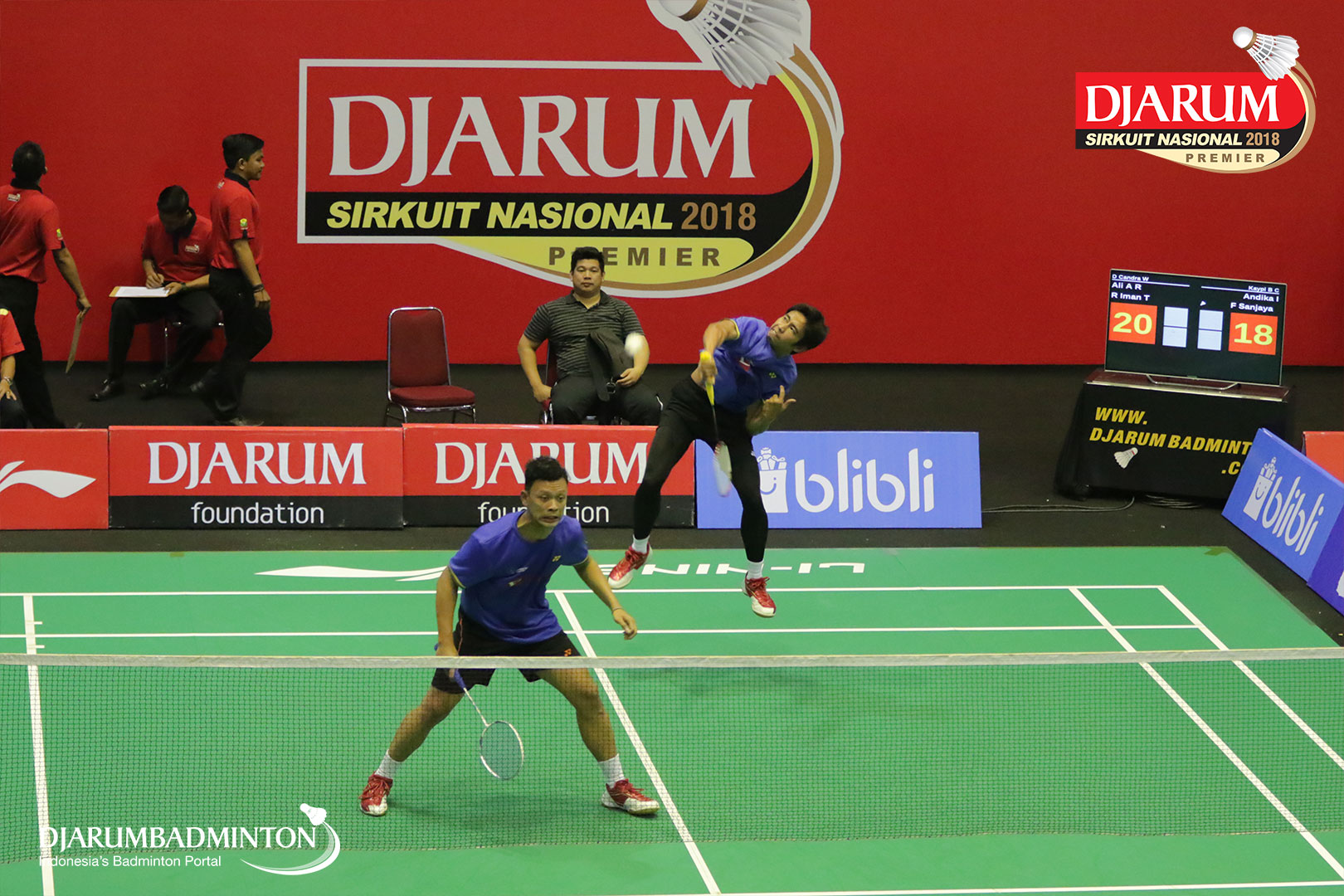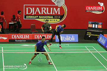 Ali Akbar Rofa Mahari dan Rizky Iman Taufik Ramdhan (Daihatsu Candra Wijaya) mengembalikan shuttlecock