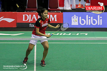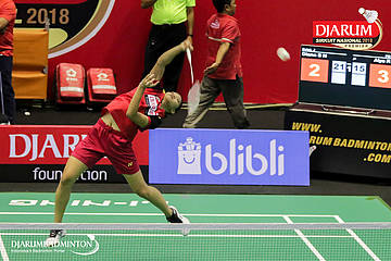 Savira Sandradewi (PB Djarum, Kudus) melakukan smash