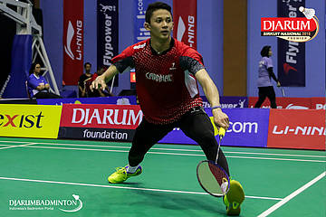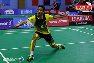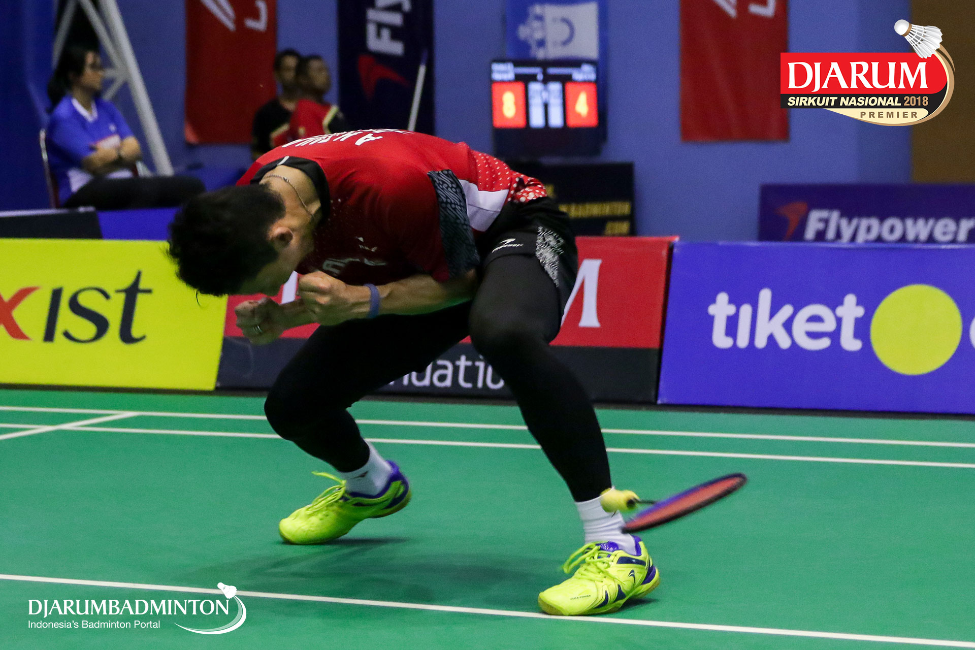 Abdul Kadir Zailani (Mutiara Cardinal, Bandung) bersiap mengembalikan shuttlecock