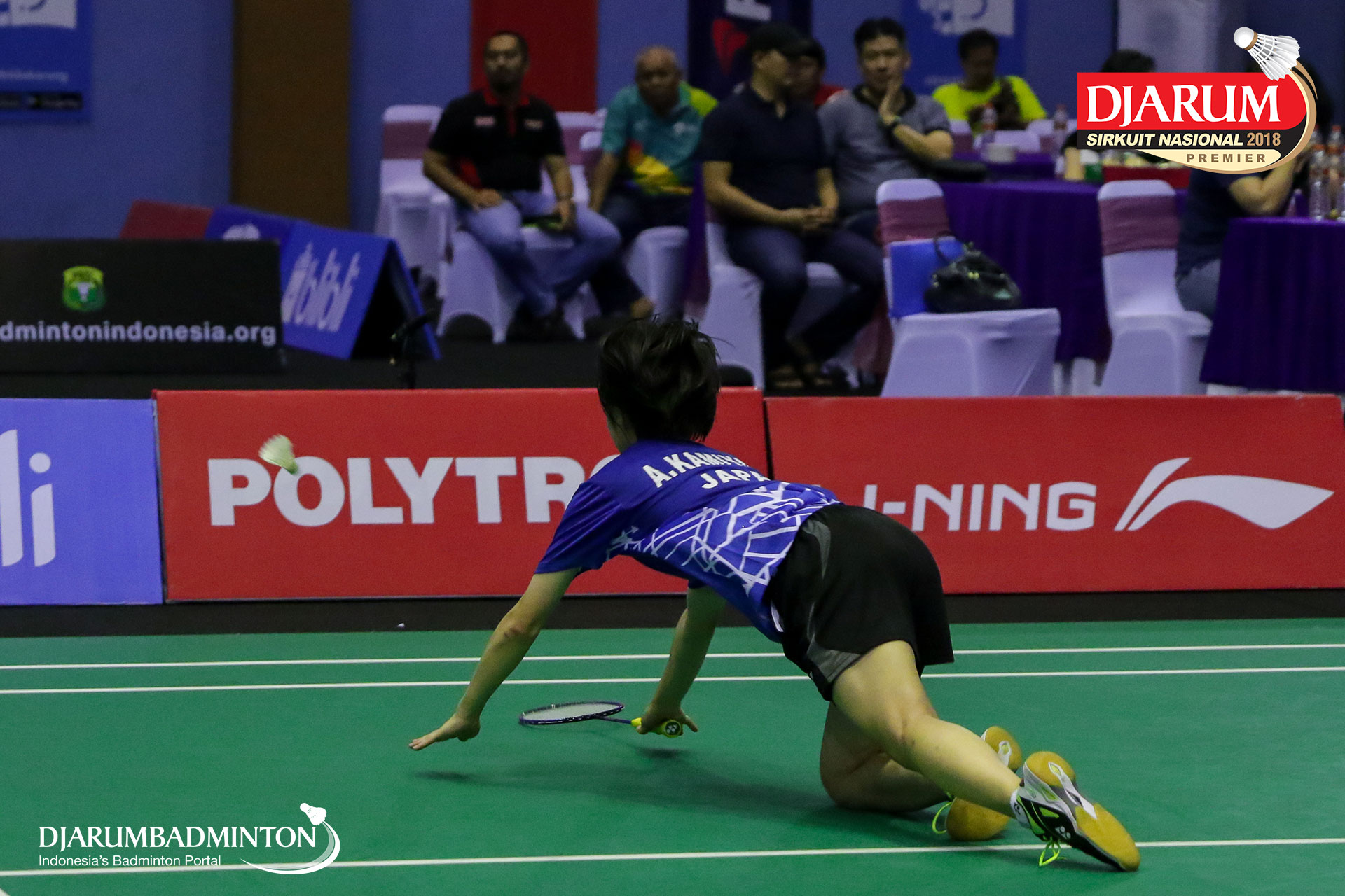 Ayumi Kamiyama (Jepang) terjatuh saat berusaha mengembalikan serangan