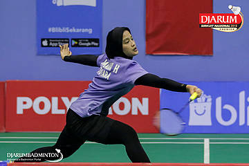 Yasnita Enggira Setiawan (Exist, Jakarta) bersiap menyambar pengembalian