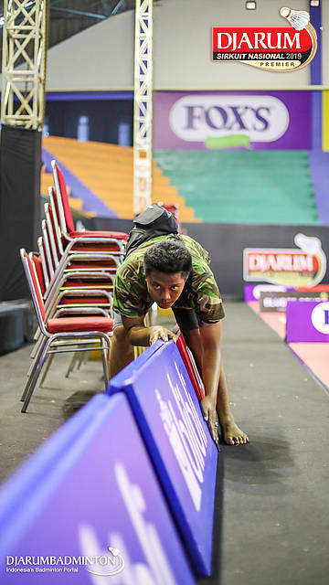 Salah satu pekerja sedang mengerjakan perlengkapan logistik Djarum Sirkuit Nasional Premier Li Ning Jawa Timur Open 2019