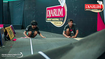 Dua orang pekerja sedang mengerjakan perlengkapan logistik Djarum Sirkuit Nasional Premier Li Ning Jawa Timur Open 2019