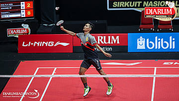 Mochammad Irsyaddullibad (Wima, Sby) bersiap menyambar shuttlecock