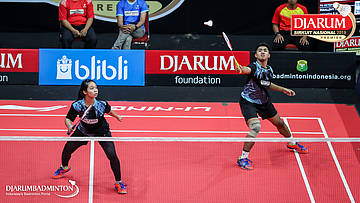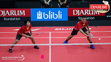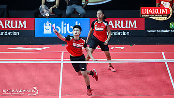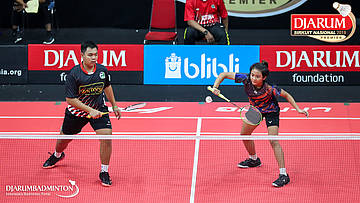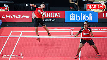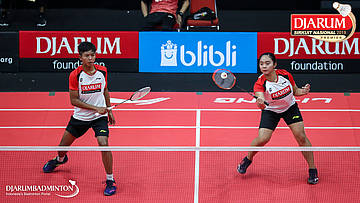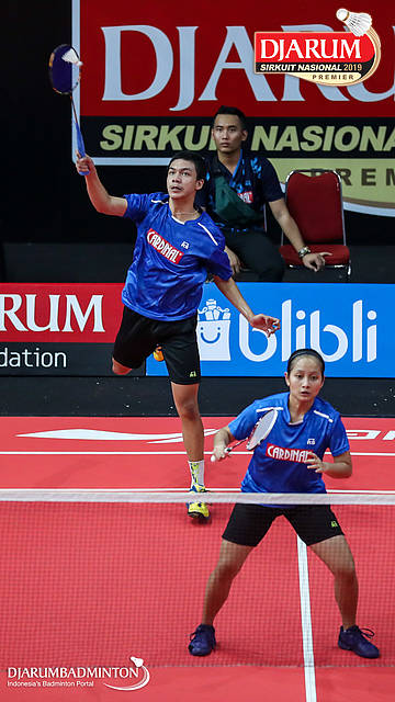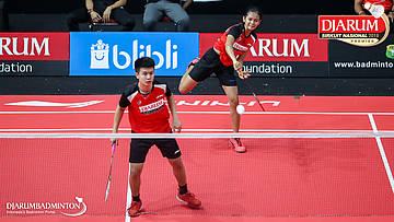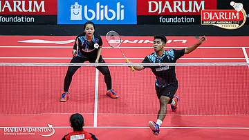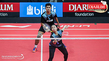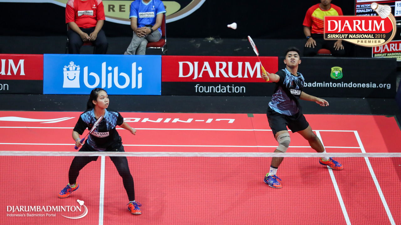 Mochamad Rafi Rizqi Kurniawan+Berliona Alma Pradisa (PB Djarum, Kudus) menyambut shuttlecock
