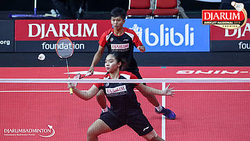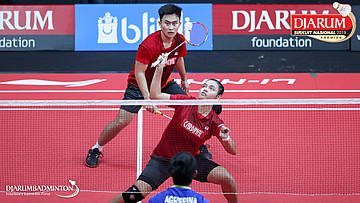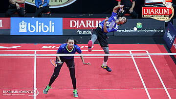 Mochamad Rafi Rizqi Kurniawan+Berliona Alma Pradisa (PB Djarum, Kudus) melepaskan serangan