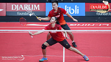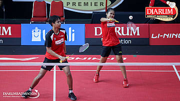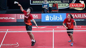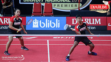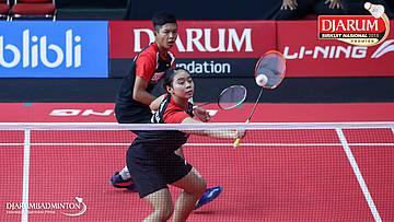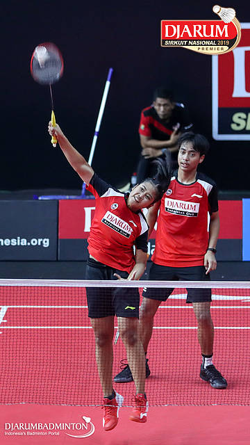 Mochamad Rafi Rizqi Kurniawan+Berliona Alma Pradisa (PB Djarum, Kudus) mengembalikan shuttlecock