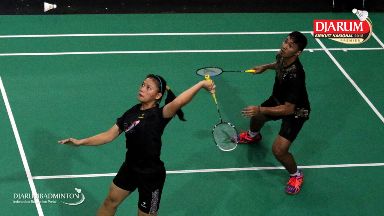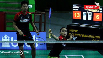 I Kadek Pande Dheva Brahmantya Putra/Sintia Dewi Yuliani (PB Djarum Kudus) Mengembalikan Shuttlecock