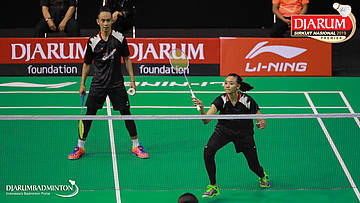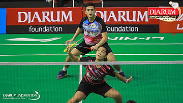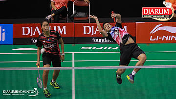 Dwiki Rafian Restu+Nita Violina Marwah (Pelatnas) bersiap menyambar shuttlecock